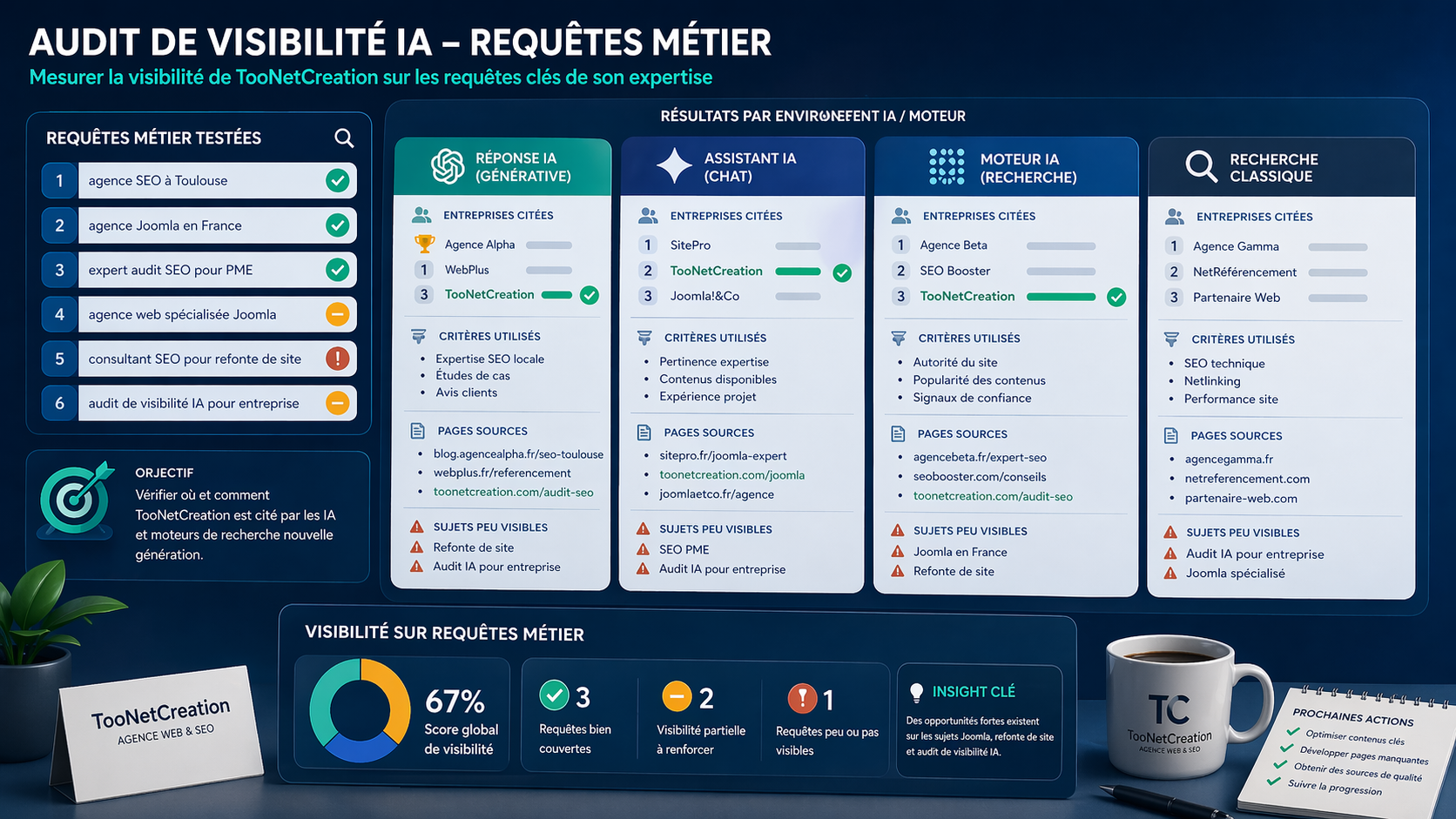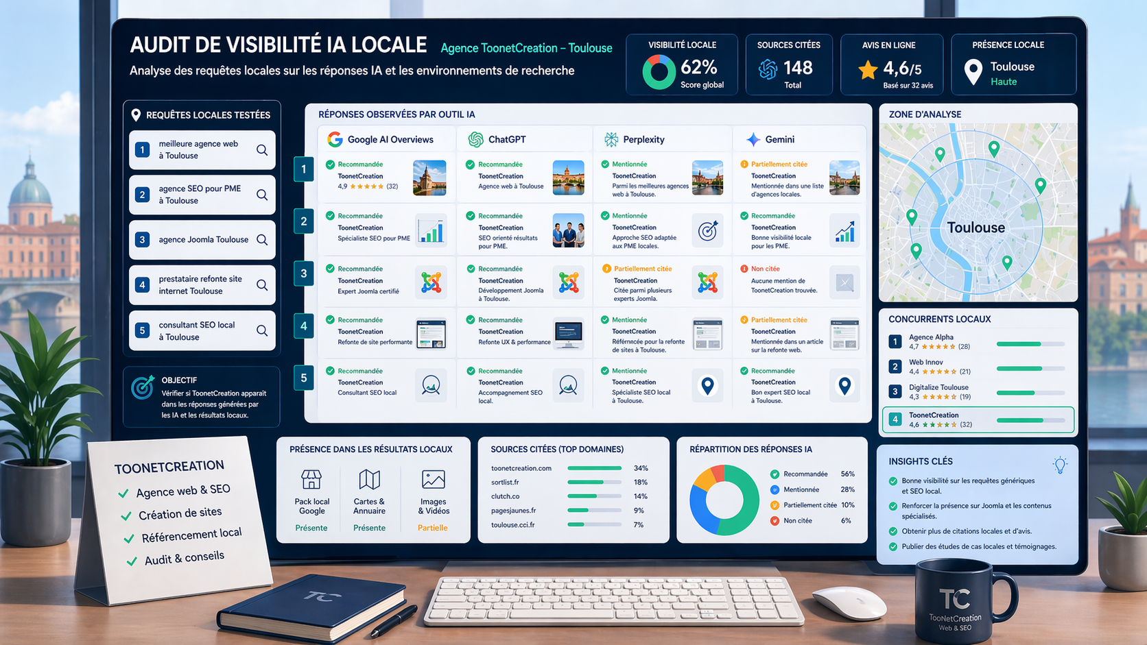 Vous voulez savoir si votre entreprise est visible dans ChatGPT, Gemini, Perplexity et Google AI Overviews ? TooNetCreation peut vous accompagner avec un audit SEO & IA orienté diagnostic, contenus et plan d’action concret.