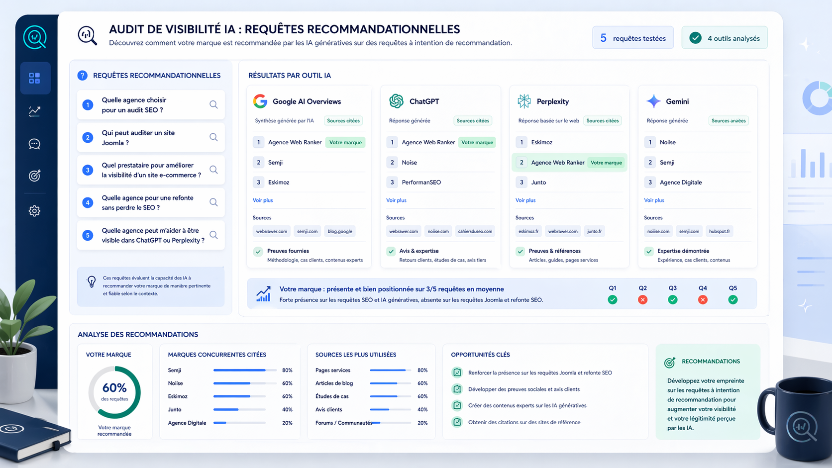 L’objectif est d’identifier les entreprises citées, les critères utilisés par l’outil, les pages sources éventuelles et les sujets sur lesquels votre marque n’est pas encore assez visible.