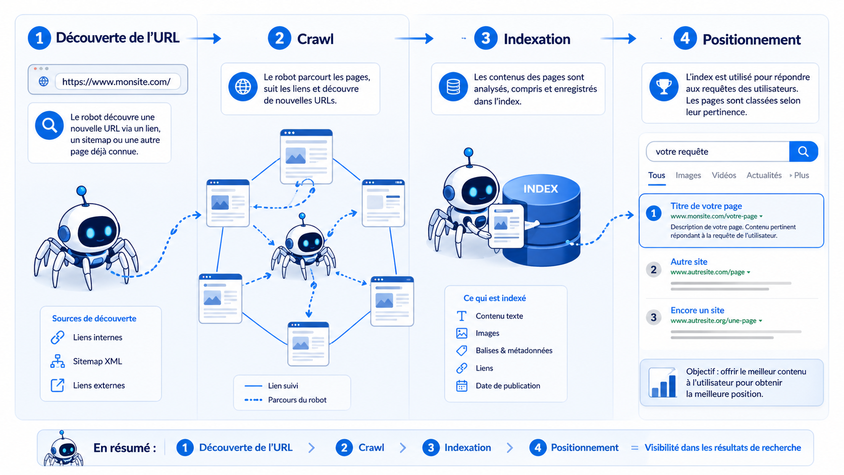| Positionnement | Google affiche la page dans les résultats selon une requête. | La page apparaît en 3e, 8e ou 25e position sur un mot-clé. |