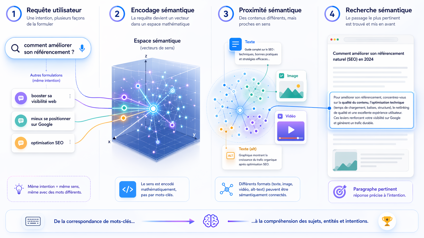 Un embedding, c’est la version mathématique du sens. Au lieu de comparer vos mots au caractère près, Google traduit les contenus – textes, images, vidéos – en vecteurs qui capturent les nuances. Deux contenus peuvent utiliser des termes différents et pourtant se “ressembler” dans cet espace numérique. C’est ce qui permet à la recherche de comprendre l’intention réelle derrière une requête, de rapprocher des questions et des réponses proches, et d’aller piocher un paragraphe très précis au milieu d’une page longue lorsqu’il répond exactement au besoin. C’est aussi la base de la recherche multimodale : une bonne légende, un alt text descriptif, un chapitrage vidéo clair, tout cela nourrit les représentations vectorielles qui aident Google à faire le lien entre texte, image et vidéo.