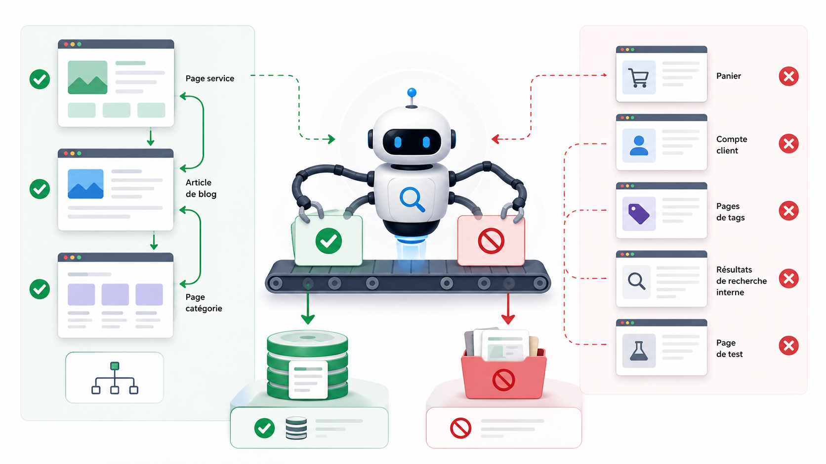 Alt recommandé : Illustration montrant la différence entre les pages utiles à indexer et les pages techniques à exclure de l’index Google.