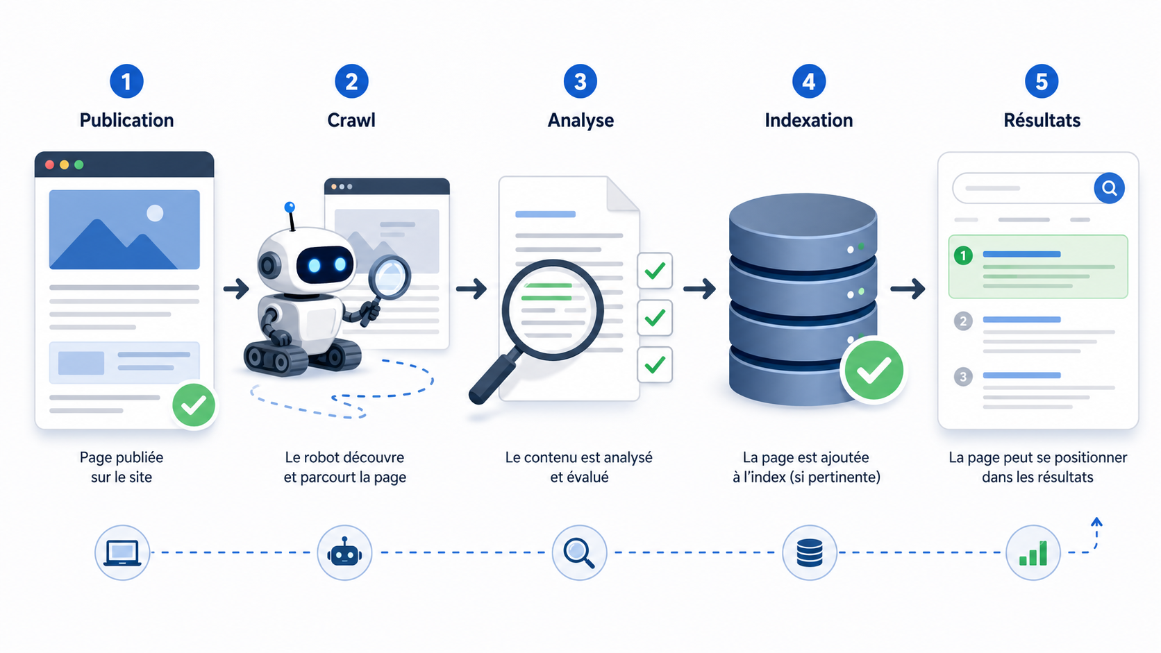 Alt recommandé : Schéma montrant les étapes entre la publication d’une page, son crawl, son indexation et son positionnement sur Google.