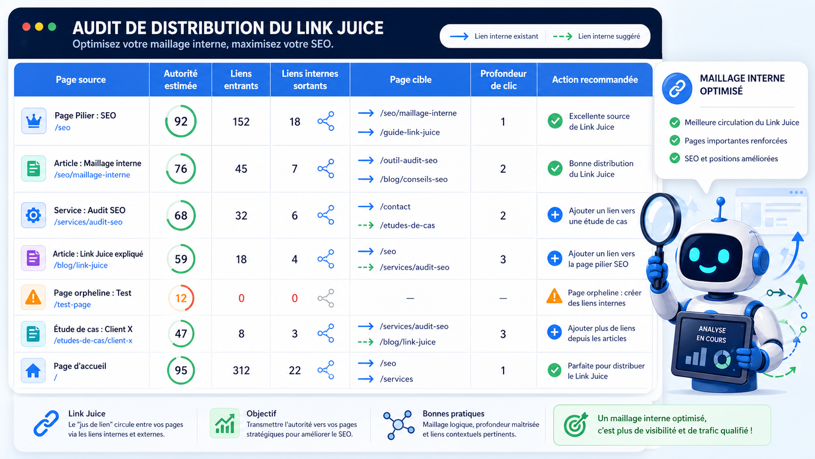 - quelles pages stratégiques manquent de liens internes ;