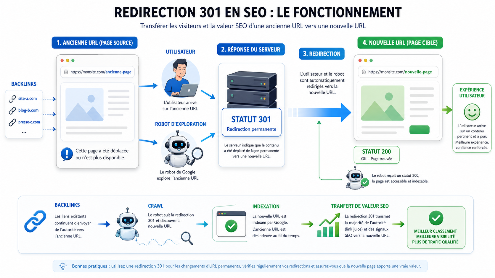 Une redirection 301 indique qu’une URL a été déplacée définitivement vers une nouvelle adresse. En SEO, elle est indispensable lorsqu’une page change d’URL, lorsqu’un site est refondu, lorsqu’un contenu est fusionné ou lorsqu’une ancienne page doit envoyer les utilisateurs vers une nouvelle page pertinente.
