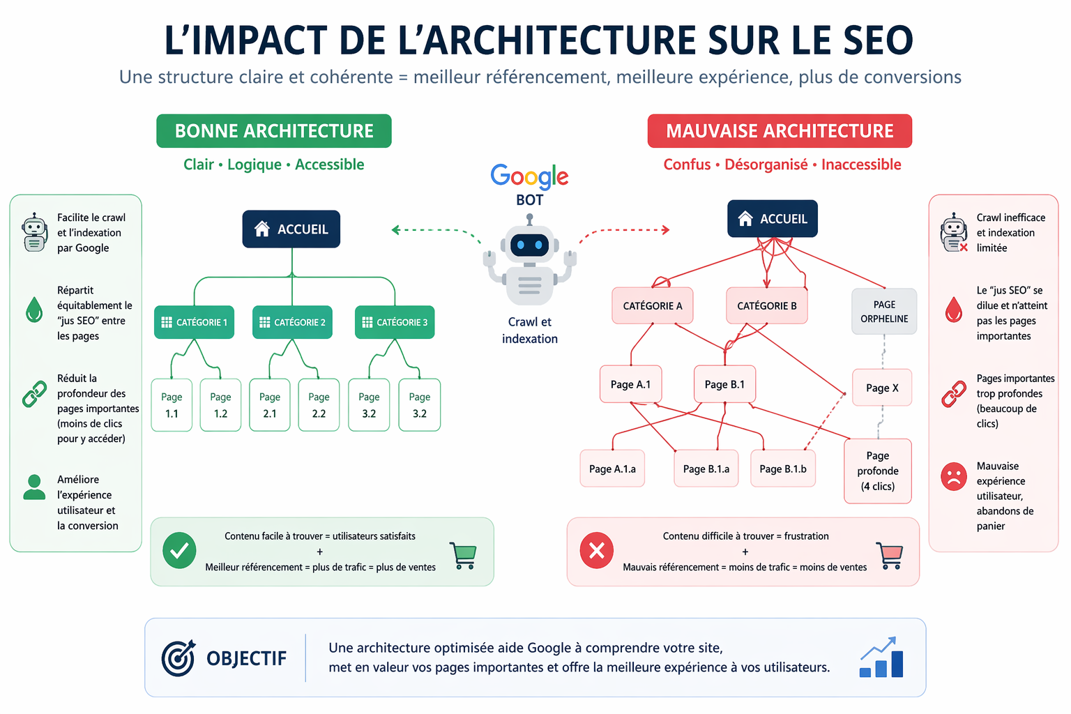 Une mauvaise architecture, à l’inverse, génère des pages orphelines, du contenu difficile à trouver, et des abandons de panier.