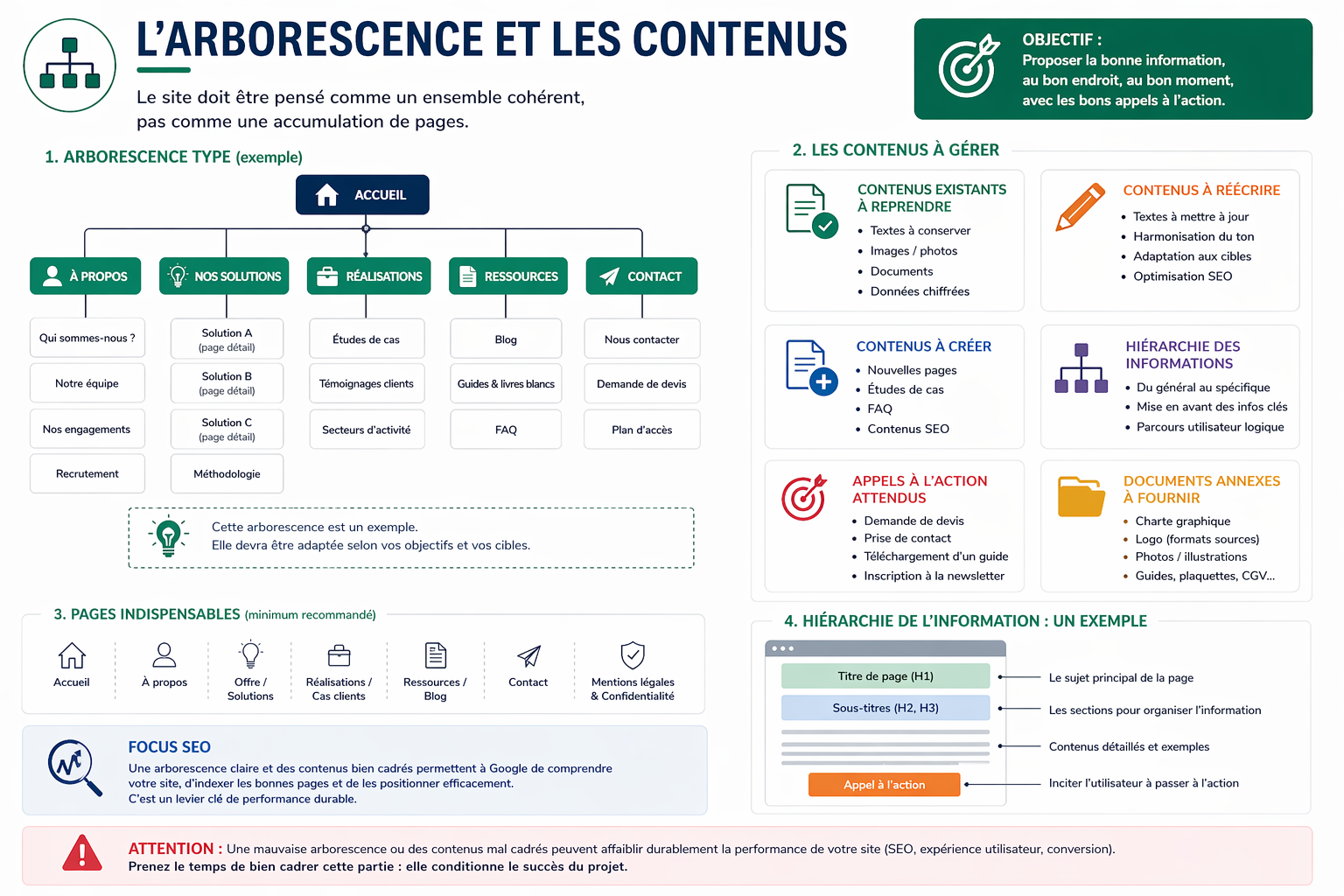 Un bon cahier des charges permet aussi d’obtenir des devis plus clairs et plus comparables. Cet article vous aide à identifier les zones floues avant signature. - Pourquoi l’arborescence est un pilier du SEO et de l’expérience utilisateur