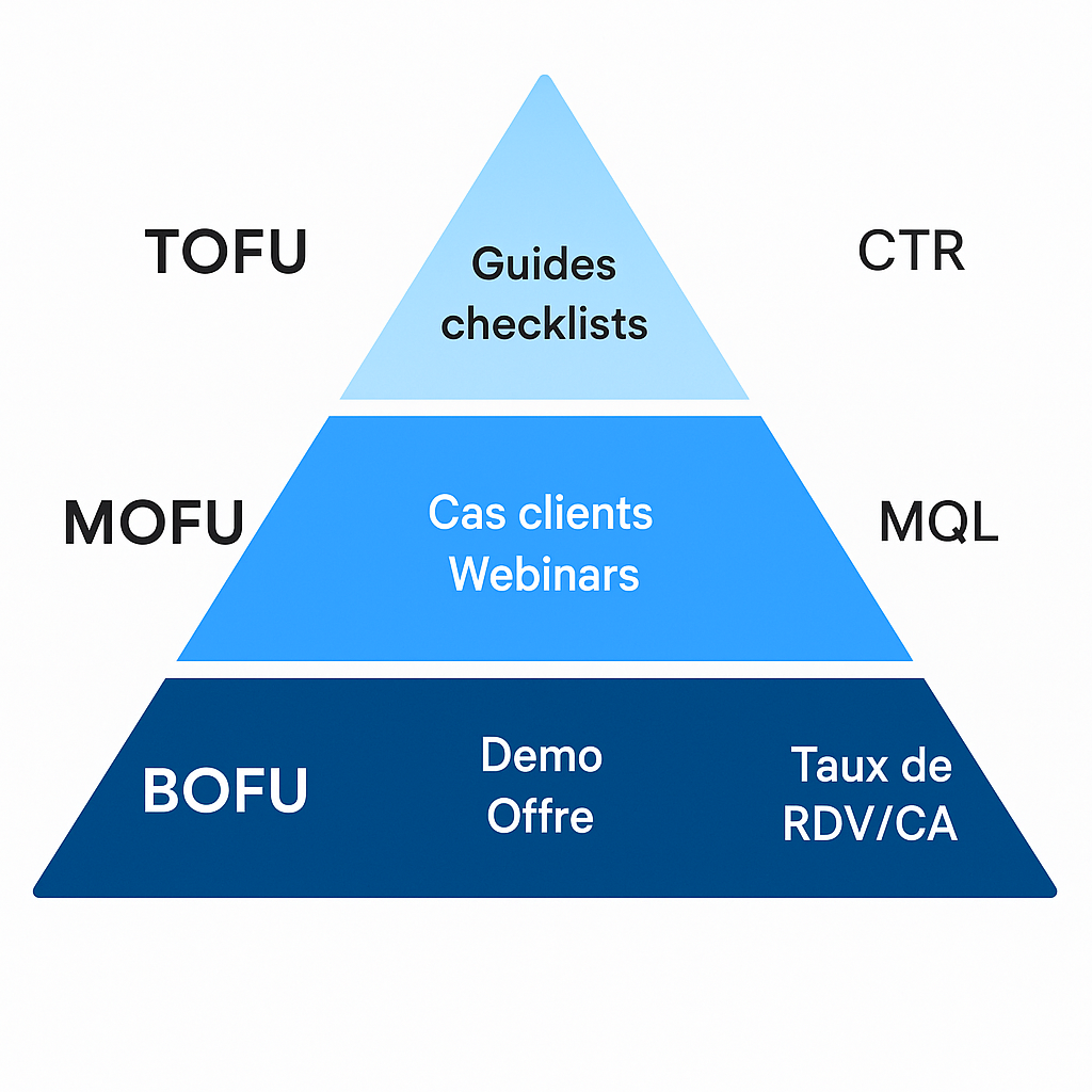 - TOFU : taux de clic (CTR), croissance de la base qualifiée