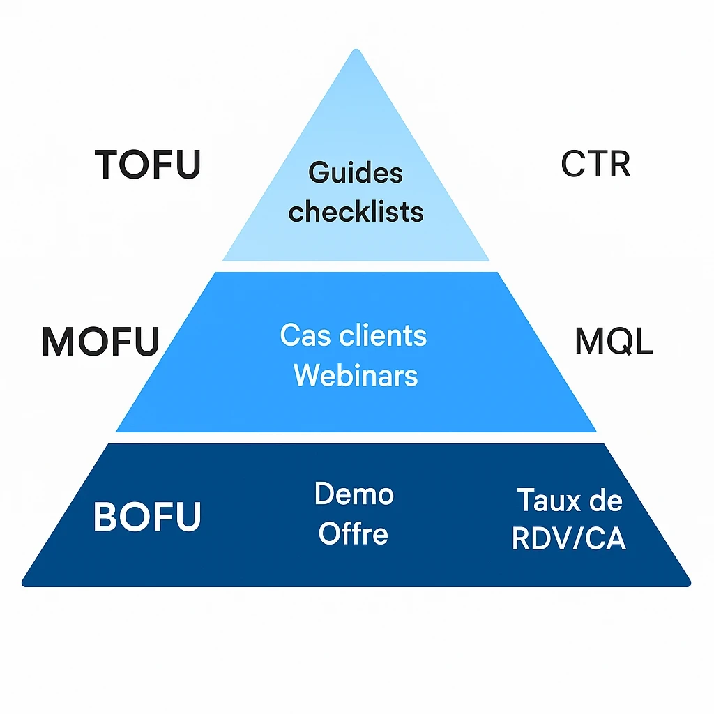 - TOFU (découverte) : attirez avec des guides, checklists et comparatifs faciles à consommer. Objectif : répondre aux premières questions et prouver votre expertise. CTA : “Télécharger le guide”, “Voir le comparatif”.